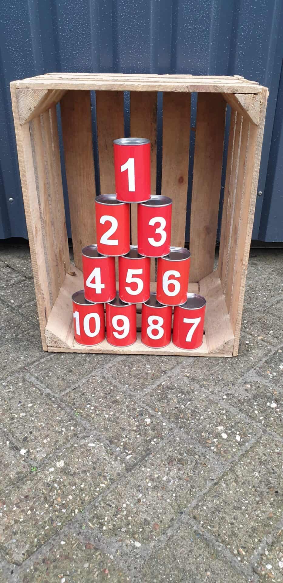 Blikgooien, probeer met de drie bijgeleverde ballen zoveel mogelijk blikken omver te gooien.