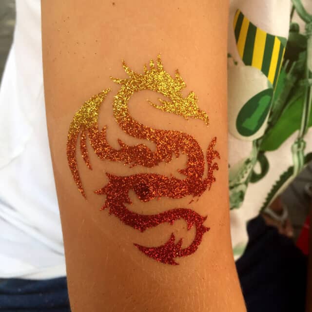 Glitter tattoo’s zijn momenteel een stoere trend. Wie wil er nou niet een coole tattoo. Een gelukje voor papa of mama deze tattoo gaat er na 4 a 7 dagen gewoon weer af. Ze zijn echt een succes op festivals, braderieën, kinderfeesten en evenementen. Tuttemien komt ze graag bij je zetten. Glitter tattoo kan ook prima in combinatie met schmink.