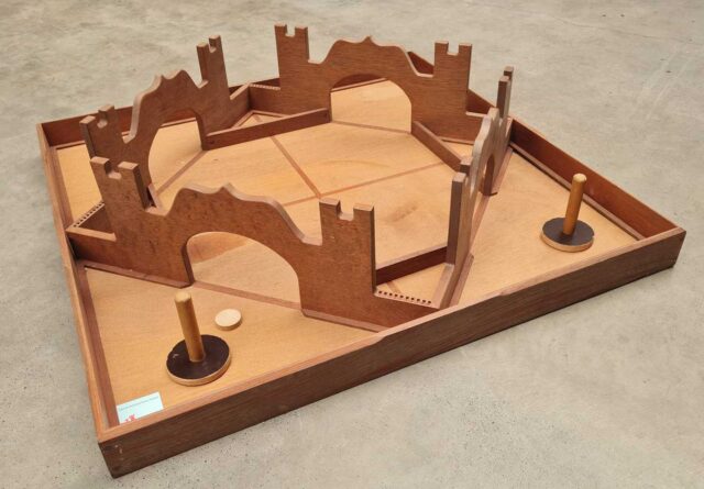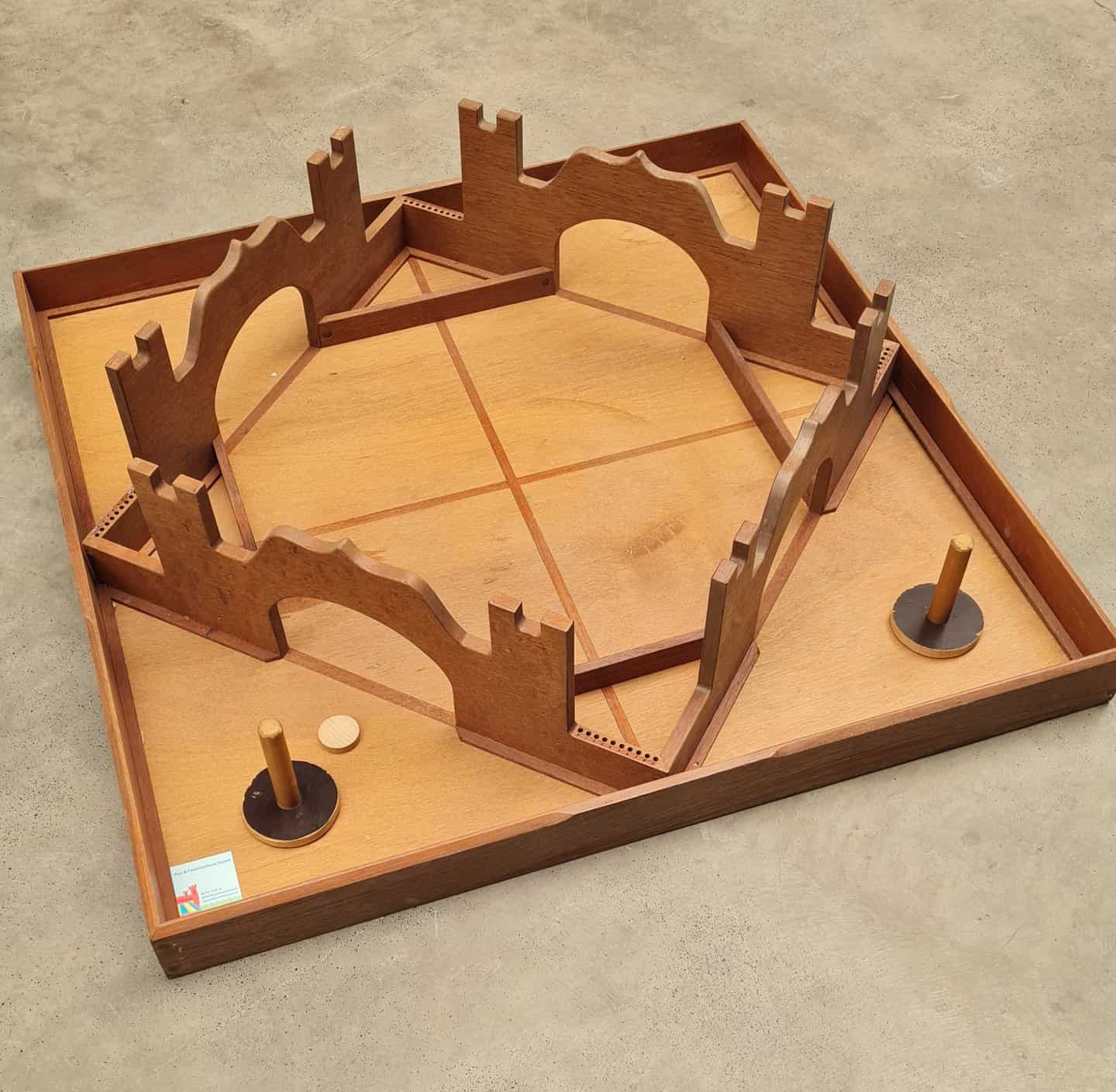 Dit grote en robuuste kastelen spel is geschikt voor alle leeftijden. De bedoeling is dat je met de bijgeleverde schuiver je eigen kasteel verdedigt. De schijf moet bij een tegenstander in zijn kasteel geschoten worden. De eerste die bij de 10 punten is wint het spel.