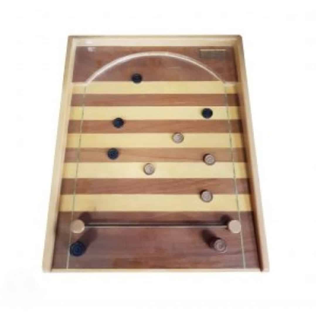 Bij het spe Shove a Penny moet je de munten over het speelveld schuiven om zo hoog mogelijk te scoren. De donkere lijn levert 1 punt op, lichte lijnen leveren geen punten op.