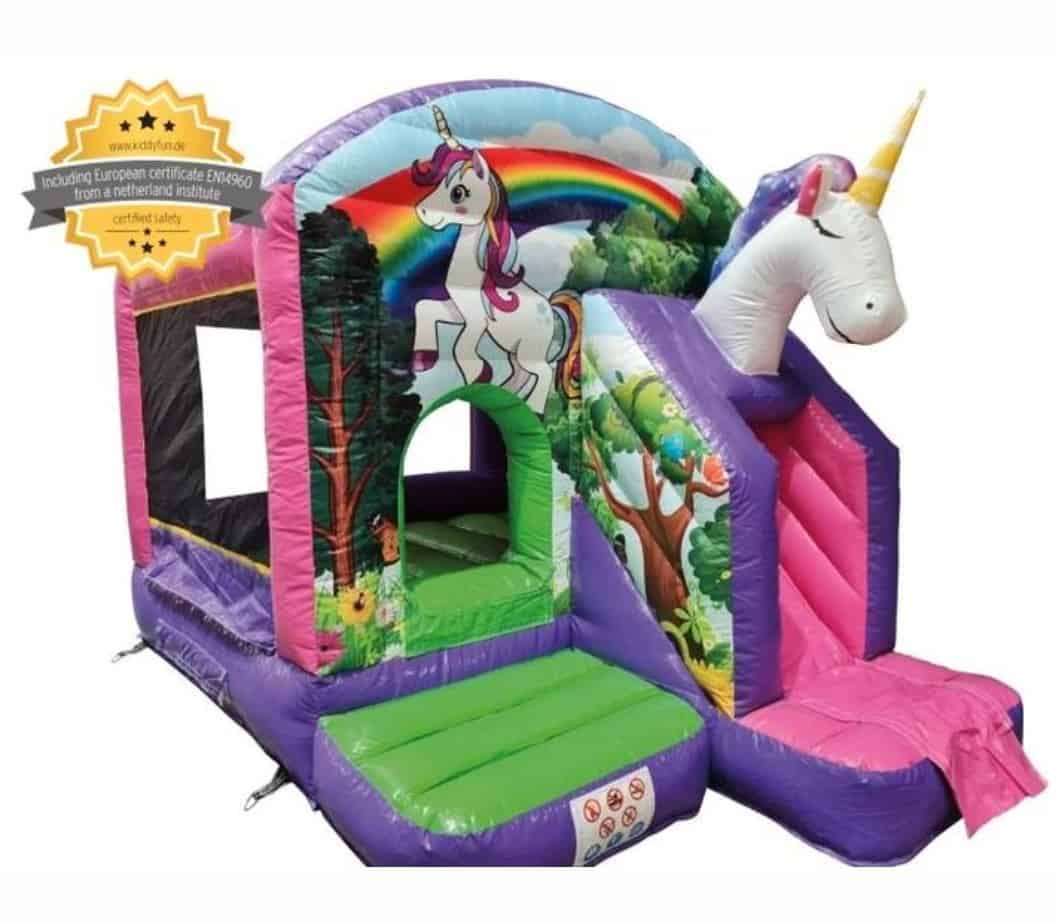 Deze knaller moet je een keer gehuurd hebben. Het Unicorn springkussen is een regelrechte crowd pleaser. Wie wil er nou niet op dit kussen springen en stuiteren. Met zijn compacte afmeting is hij zeer geschikt voor tuin of oprit. Het kussen is voorzien van een dak en is rondom afgewerkt met netten wat hem zeer veilig maakt. Zoef via de glijbaan naar buiten, nog een rondje doen?