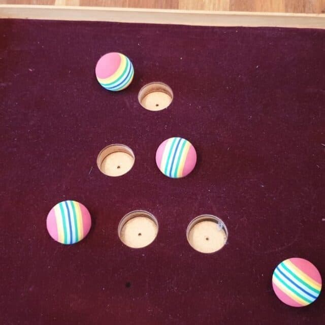 Met de bijgeleverde keu schiet je de ballen richting de gaten. Het achterste gat levert de meeste punten op. Hoeveel punten weet jij te scoren?