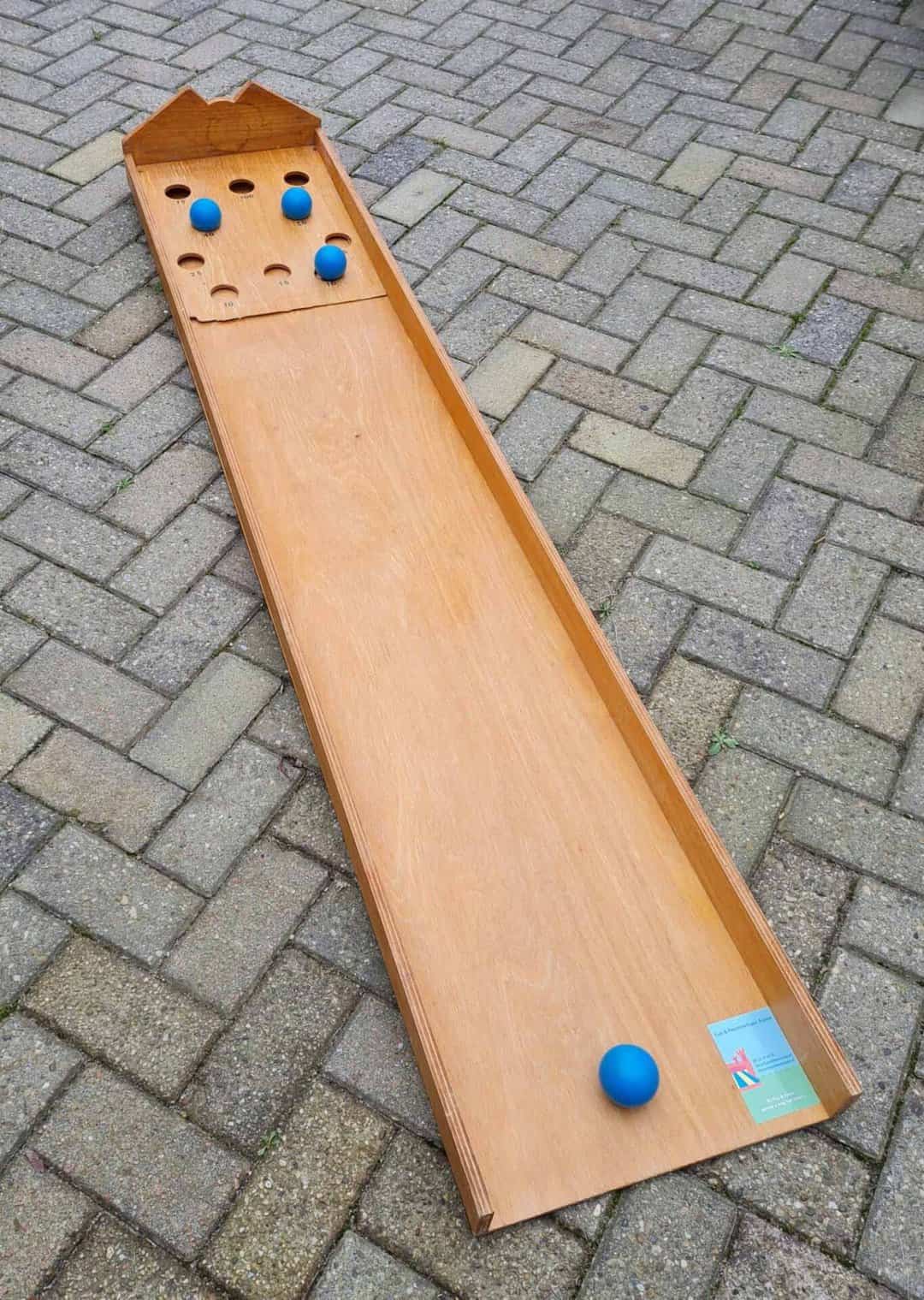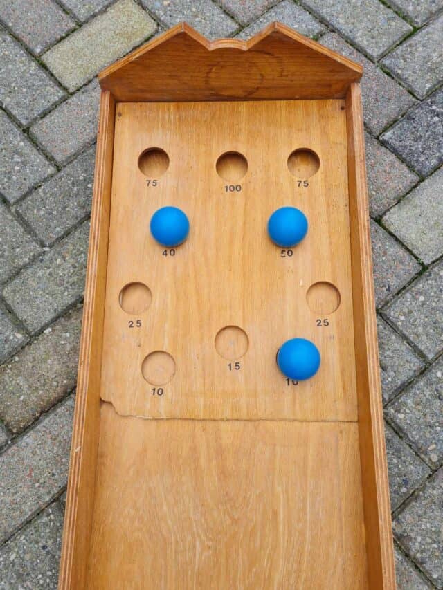 Het lijkt wel een heus kermisspel. Dit spel is geschikt en vermakelijk voor jong en oud. Goed richten en gooi de ballen in de punten. Degene met de meeste punten die wint het spel.